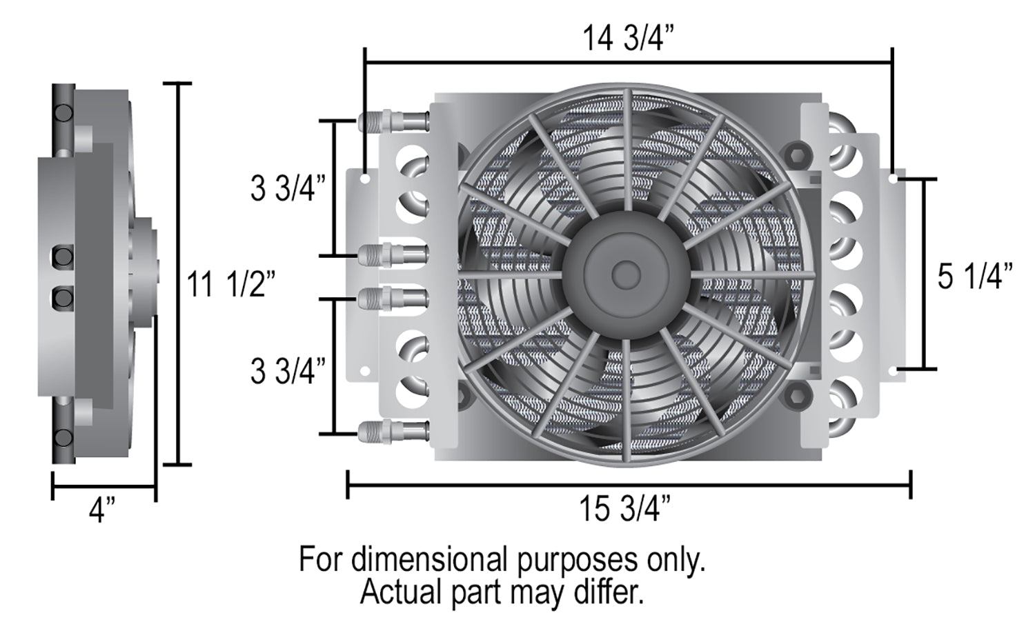 Combining an efficient 4 & 4 Pass copper/aluminum Made in the USA cooler core with a powerful 10" Tornado electric fan, this compact remote cooler cools two separate systems with one compact design that can be mounted literally anywhere space permits. Includes clear anodized aluminum mounting brackets, (2) -8AN x 3/8" and (2) -8AN x 1/2" brass hose barb fittings to adapt to a wide variety of heat removal requirements.