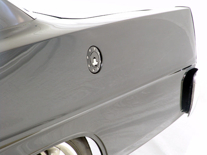 Billet aluminum gas cap, universal fit, locking, anodized Silver. Includes cap, 2 keys, housing, neck, and gaskets.