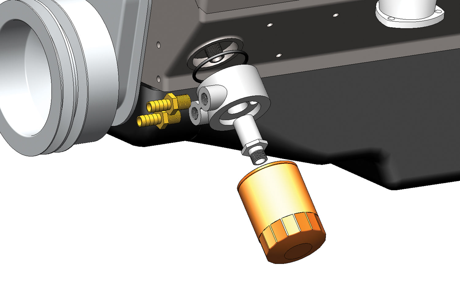 High quality die-cast aluminum thermostatic sandwich adapter with 3/8" NPT ports and an O-ring diameter of 2 3/4" and 3 1/2", this adapter provides external oil lines to allow the addition of an engine oil cooler. It installs between the stock engine oil filter landing and the oil filter. Stock filter is retained. Designed to be used on engines with a 13/16"-16 filter thread. Kit includes sleeve nut and hose barb fittings.